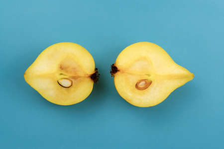 Two halves of a yellow pear lies on a blue background