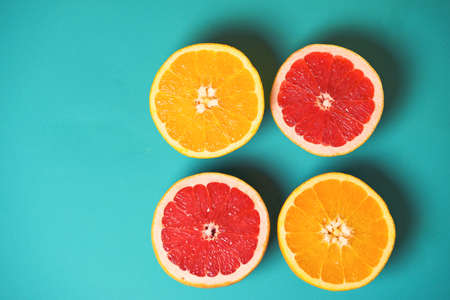Citrus fruits on abstract geometry colored paper texture minimalism background