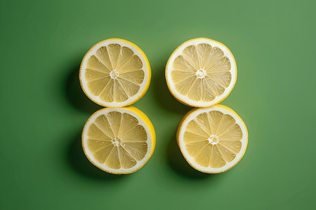 Generative AI Image of Fresh Healthy Sliced Lemons on Clean Empty Plain Green Surface