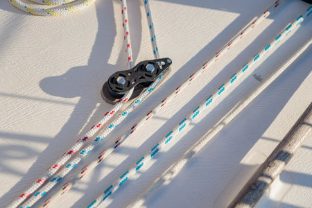 Closeup view of ship rope tackles on outdoors sunny blue sky background