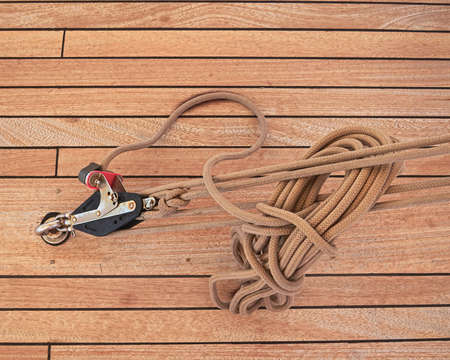 Yachting. Sailboat view of different parts of yacht, block with rope. Detail of a sailing boat