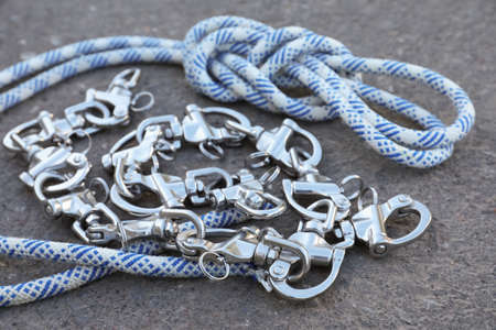 Nautical mooring rope hanks on a sailboat. Horizontal shot