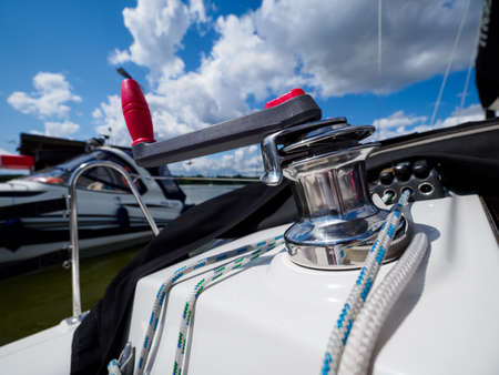 Winch with rope on sailing boat. Yacht detailed parts. Yachting Baltic sea summer vacation. Tourism luxury lifestyle.