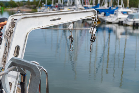 Detailed closeup of rigging on sail boat during cruise. Marine objects concept.