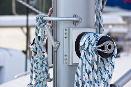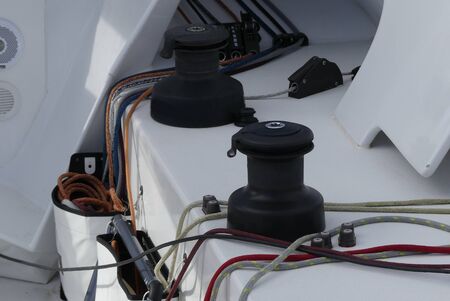 Details of winches and ropes on sailing boat racer, boating concept