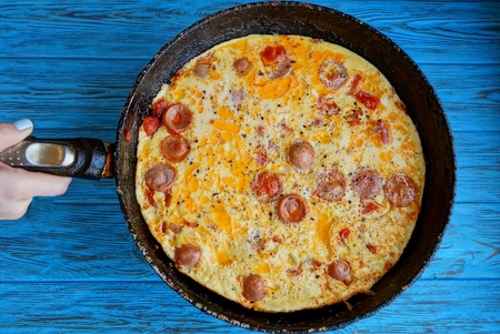 Omelet with sausages, yellow cheese and tomato