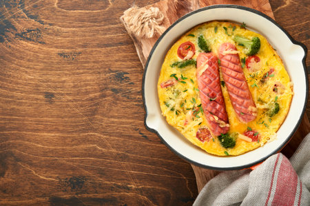 Omelette or frittata with two sausages, melted cheese, cherry tomatoes, broccoli and parsley on red skillet or iron pan on old wooden rustic table background. Healthy breakfast food concept. top view