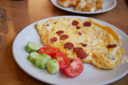 Delicious breakfast with omelet and fresh vegetables on a plate