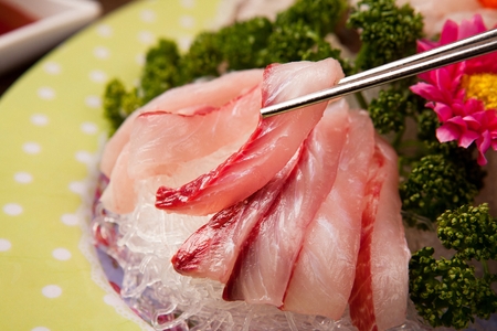 Hand taking sea bass sashimi with chopsticks. Raw sea bass with the sauce on white plate. Japanese restaurant. Japanese traditional food. Raw fish.