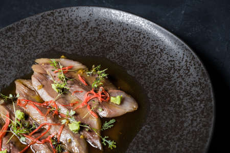 Sea bass sashimi with sauce on white plate, black decanter with sake and glass on the table. Japanese restaurant. Japanese traditional food. Raw fish