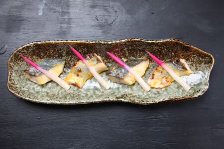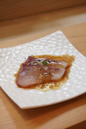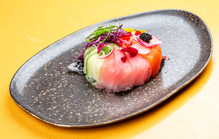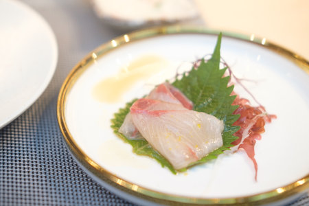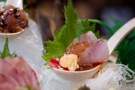 Sashimi on a plate in a Japanese restaurant, closeup of photo