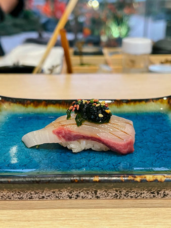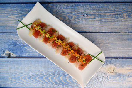 Tuna sashimi on a blue ceramic plate in Japanese restaurant