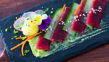 Vibrant tuna sashimi arranged on a plate, showcasing its rich color and delicate texture for an exquisite meal. black background. top view.