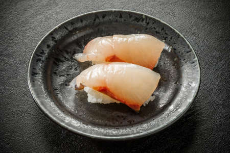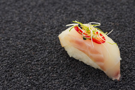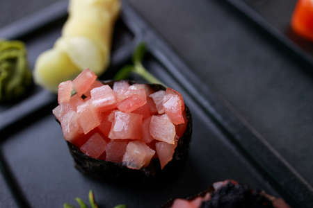 Tuna gunkan sushi set decorated with caviar, served on black plate. Restaurant menu, Japanese food delivery