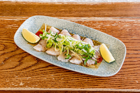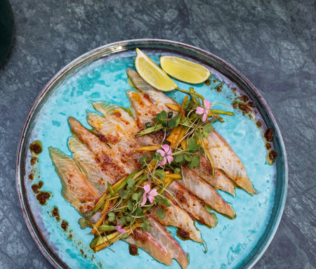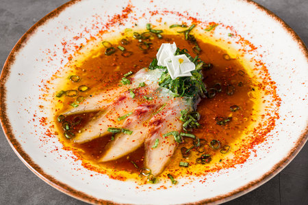 Sliced seabass carpaccio in citrus soy dressing with herbs