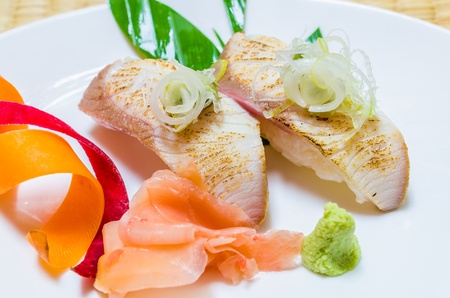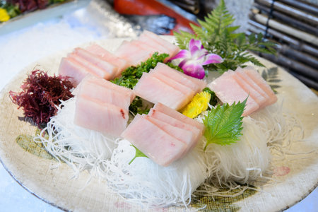 Selective focus of Hamachi Sashimi - Raw yellow tail fish fillet on ice serve with wasabi and sliced radish - fine Japanese restaurant