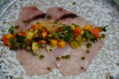 swordfish carpaccio with fruit salad. Italian food Smoked Swordfish Carpaccio.