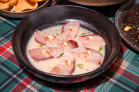 Turkish appetizer Pickled Tunny Fish with Olive Oil (Turkish name; Lakerda)