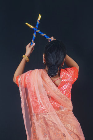The intriguing stock photo shows young Indian ladies in the rear, ready to play the traditional dance known as dandiya, which is done during Navratri. Ready to embrace the dance's rhythmic beats, they carry ornamented dandiya sticks while wearing colorful orange sarees adorned with shimmering details and blue blouses. Their clothing and stance, accentuated by elaborate hair decorations and golden bangles, capture the excitement and elegance of this customary celebration of Navratri while also reflecting the joyful mood and cultural richness of the occasion.