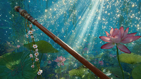 Low-angle view captures a wooden staff adorned with delicate white flower garlands leaning across a dense, vibrant aquatic environment filled with pink lotus flowers and large pads, illuminated by bright, sparkling shafts of light piercing down through the turquoise water.