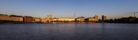 Panoramic view at the Binnenalster in Hamburg at the golden hour, in the foreground you can see the silhouette of a rower, horizontal