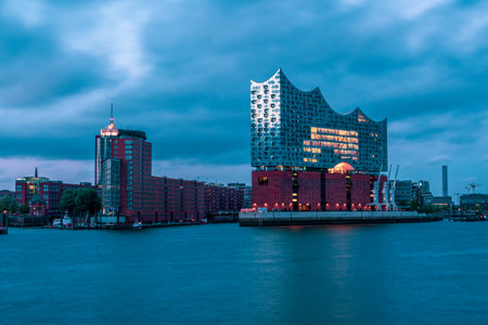 Modern Architecture in Hamburg, Germany Cityscape with River View at Dusk, Elbphilharmonie