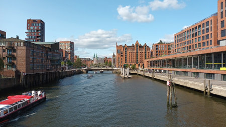 HAMBURG, GERMANY - 28 JUNE 2018: Elbe river and buildings at warehouse district