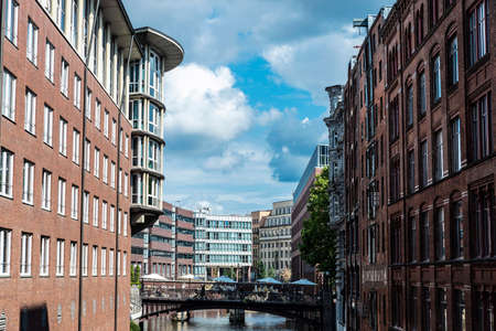 Hamburg, Germany - August 21, 2019: Modern and classic buildings next to a canal with a bridge called Michaelisbrücke in the neighborhood of Neustadt, in the center of Hamburg, Germany