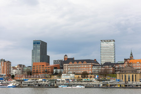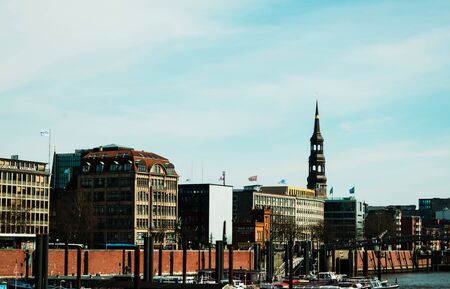 Hamburg horbor waterfront cityscape with Elbe river and St. Pauli Piers on sunny day