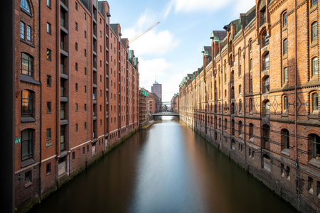 Historic brick warehouses reflect on the calm water of the canal in Speicherstadt Hamburg, Germany. The scene captures the charm of the city's architecture under a clear sky.