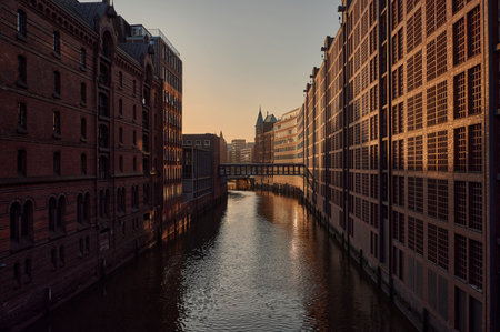 famous historic warehouse district Speicherstadt in Hamburg, Germany in golden sunlight