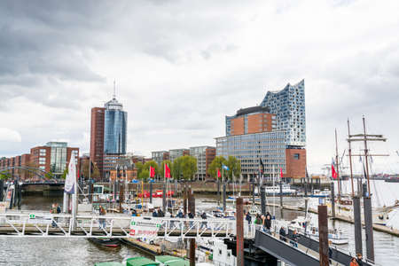 Hamburg, Germany, May 11, 2019: Hamburg city canal and modern buildings, Hafencity in Hamburg, Germany