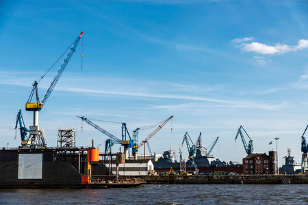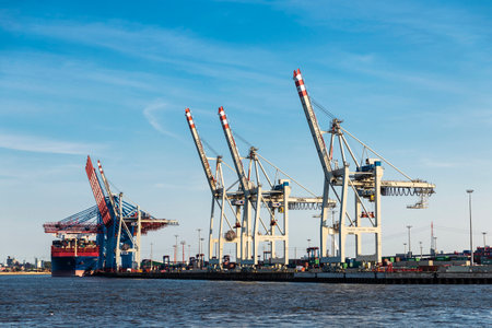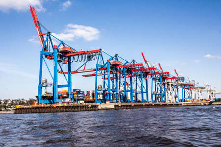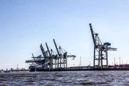 Hamburg, Germany - August 22, 2019: Container cranes in the port on the Elbe river in Hamburg, Germany