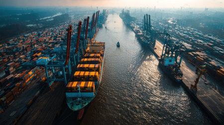 An overhead shot depicts cargo ships navigating a large waterway. The scene features a busy port with numerous containers and cranes. The colors include shades of blue and brown, with sunlight reflecting on the water. This image suits various commercial uses, including illustrating logistics or shipping.