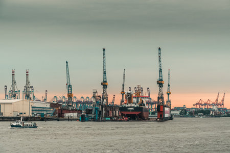 Hamburg, Germany, June 16, 2025: Cranes in the port of Hamburg at sunset