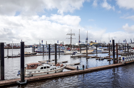 HAMBURG, GERMANY - April 18, 2018: St Pauli Landungsbrucken landing place in Port of Hamburg between the lower harbour and Fish Market on Elbe river