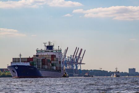 Hamburg, Germany, 19 April 2018: Cargoship in the port of Hamburg on Elbe river, Germany