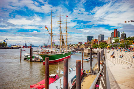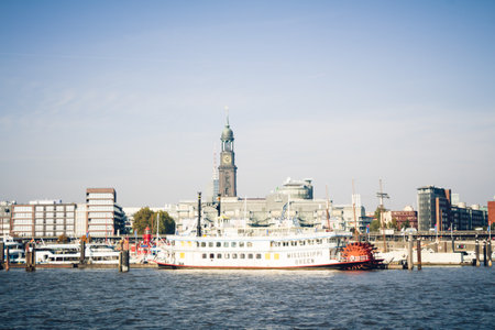 Hamburg. Germany. - May 06, 2016: Beautiful view of the famous harbor and traditional steamer on the Elbe river, St. Pauli district, Hamburg, Germany