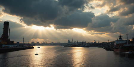 Panoramic view of Hamburg Harbor from Hansestadt with dramatic stormy clouds and sunlight