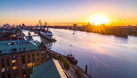 Hamburg harbor at sunrise with a bright sunburst over the water, illuminating cranes and buildings.