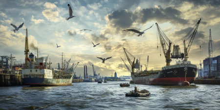 A bustling harbor with large ships, cranes loading cargo, and seagulls flying overhead. The industrial and maritime scene evokes a sense of energy and movement.