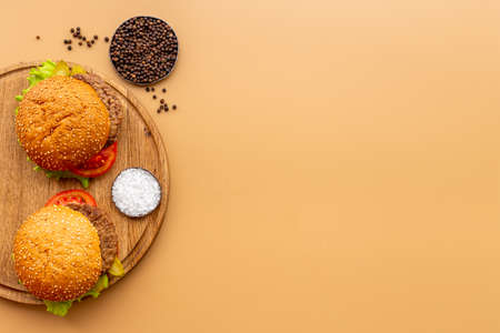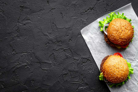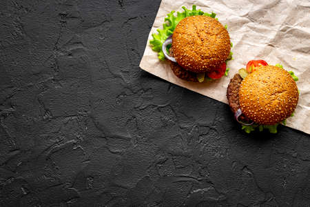 Fastfood meal - hamburgers with beef meat steak and vegetales. Top view