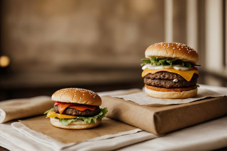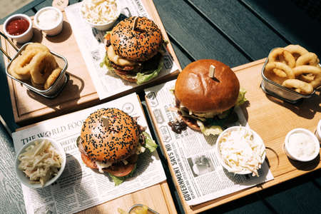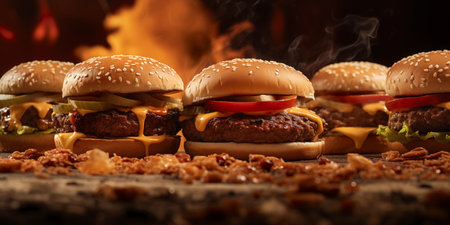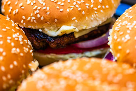 Fast Food delivery service. Tasty Burgers background. Unhealthy meal. Takeaway cheeseburger, street food. Barbecue, grill