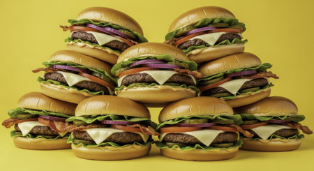 Nine delicious juicy burgers stacked in a staggered pyramid on a yellow background. each burger features a grilled patty, melted cheese, crispy bacon, fresh lettuce, tomato, red onion, and pickles.