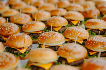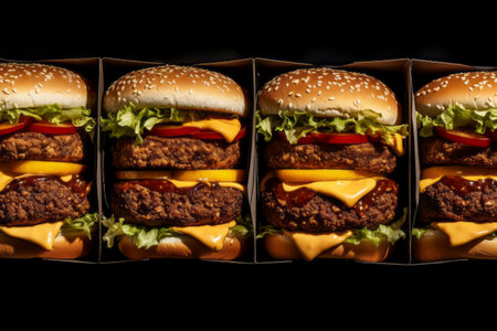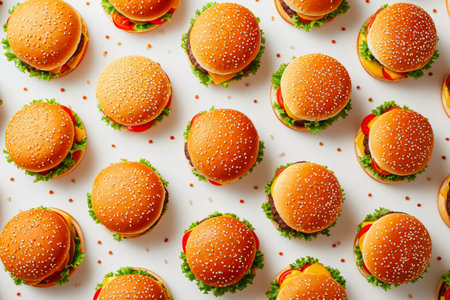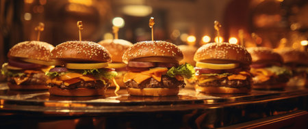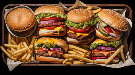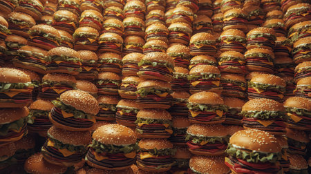 A row of hamburgers and fries are piled on top of each other. The hamburgers are topped with cheese and lettuce, and the fries are golden brown. Concept of abundance and indulgence