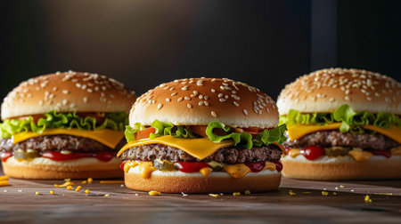 Three mouthwatering gourmet burgers with fresh lettuce, tomatoes, and cheese, artfully arranged on a rustic wooden board against a dark background.