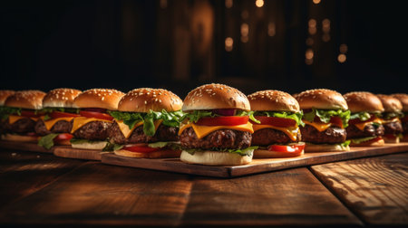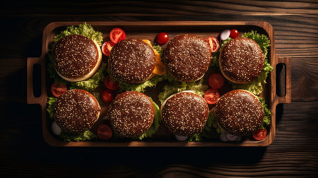 burgers with vegetables on a brown wooden tray, presented in an abstract illustration with copy space. this artwork, inspired by the style of unreal engine 5, showcases the talent of mark seliger and jimmy lawlor. with its photorealistic detailing, volumetric lighting, and darktable processing, this 32k uhd image captures the essence of a delicious meal. ai generated