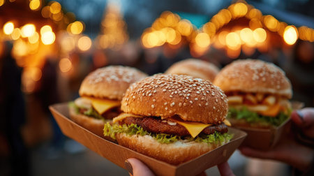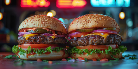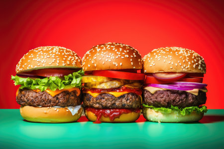 Delicious gourmet burgers with fresh ingredients on a vibrant background