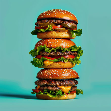 Multiple stacked fast food burgers on a tray, showcasing juicy patties and crisp vegetables with melted cheese.