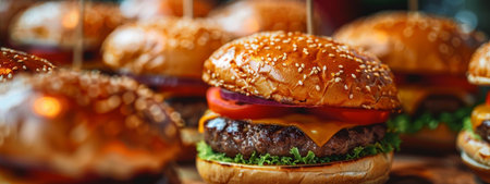 A close-up of mouthwatering cheeseburgers with melted cheese, tomatoes, lettuce, and sesame seed buns, creating a tempting and appetizing food scene.